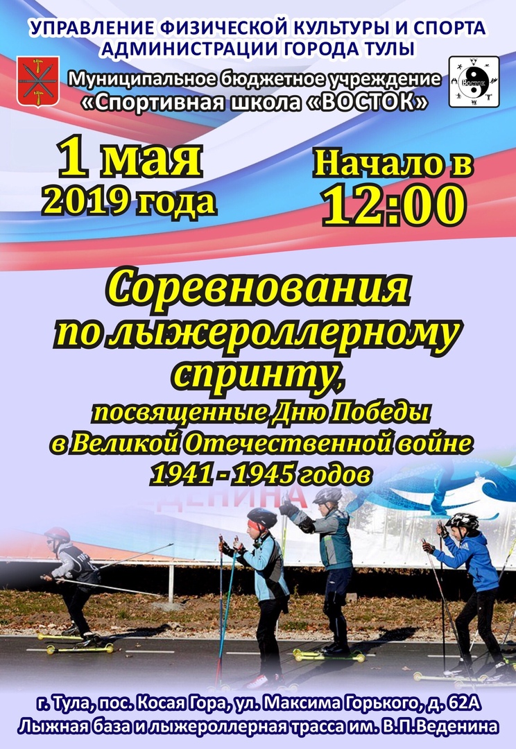 1 мая в Туле, пос. Косая гора (ул. М. Горького, 62А) лыжная база и лыжероллерная трасса им. В.П. Веденина состоятся соревнования по лыжероллерному спринту, посвященные Дню Победы в Великой Отечественной войне 1941-1945 годов. Начало соревнований в 12-00, регистрация участников в 10:00.