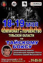 18 - 19 мая по адресу город Тула, ул. Серебровская, 30 (учебный центр спортивной школы «Восток») состоится чемпионат и первенство Тульской области по тайскому боксу, посвященный Заслуженному тренеру России Лихожону Сергею Васильевичу. Начало соревнований в 12:00. Церемония открытия в 14:00.