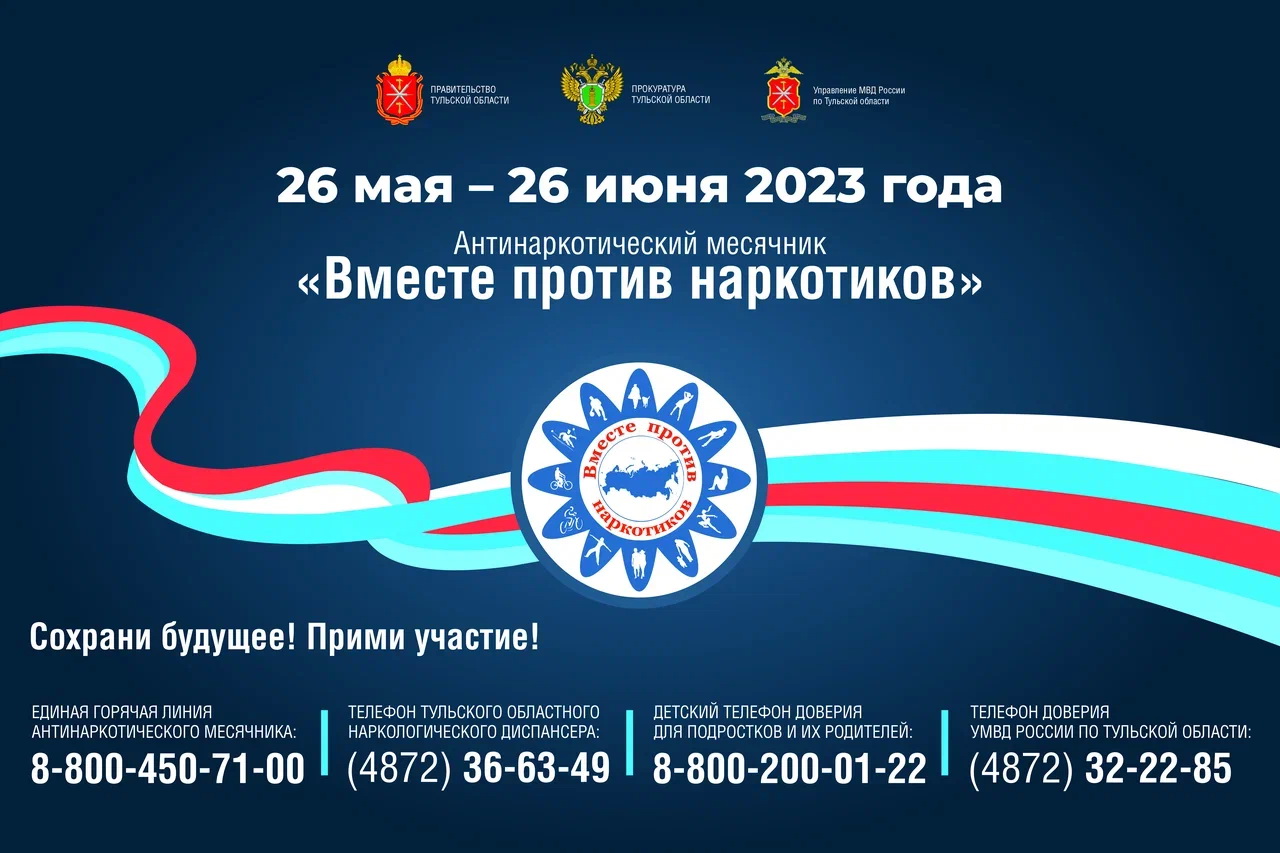 В период с 26 мая 2023 года по 26 июня 2023 года на территории Тульской области будет проводиться месячник антинаркотической направленности и популяризации здорового образа жизни, приуроченный к Международному дню борьбы с наркоманией и незаконным оборотом наркотиков. Основные задачи месячника: