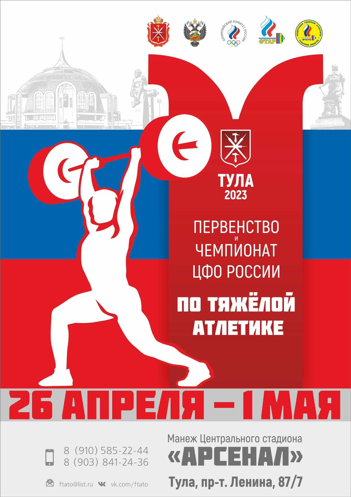 С 26 апреля по 1 мая 2023 г. в Туле на базе Центрального стадиона «Арсенал» состоялись Чемпионат и Первенство ЦФО России по тяжелой атлетике.
