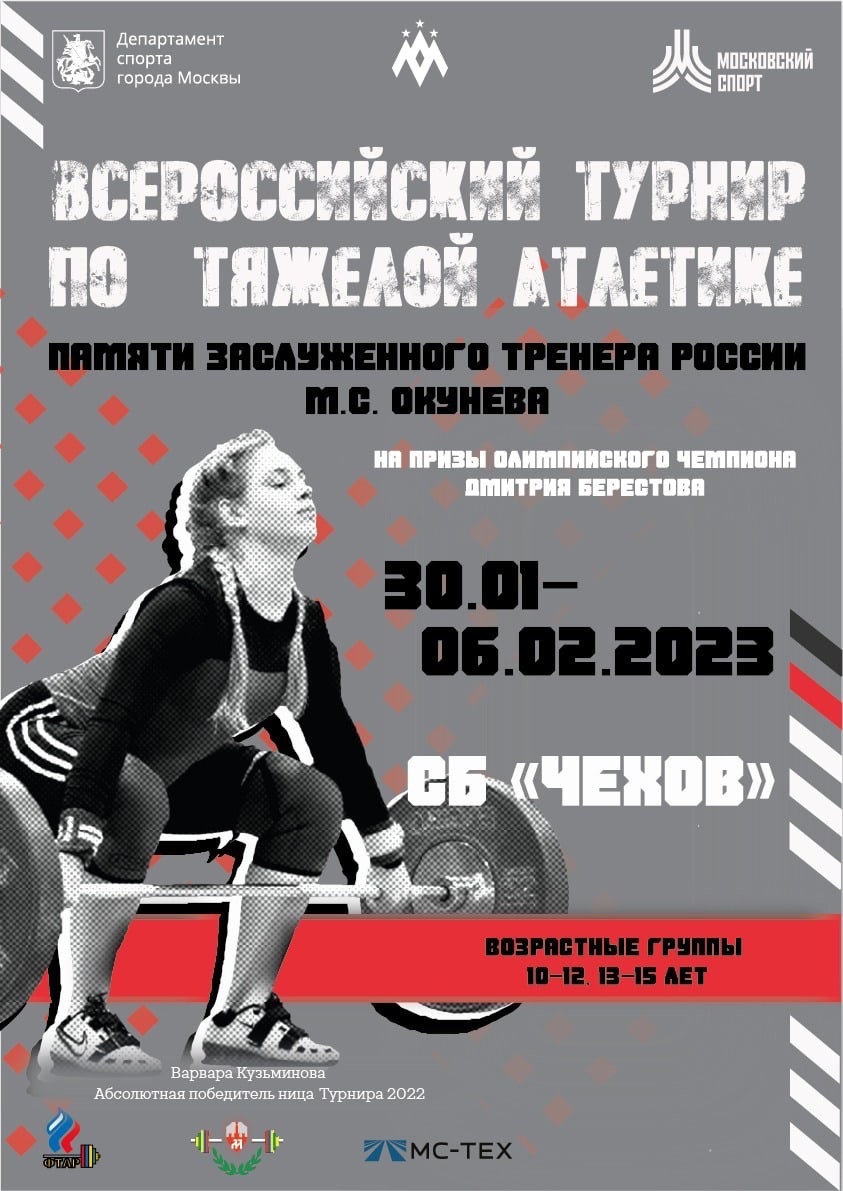 С 30 января по 6 февраля 2023 г. на СБ «Чехов» состоится XVIII Всероссийский Турнир по тяжелой атлетике памяти Заслуженного тренера России М.С. Окунева на призы Олимпийского чемпиона Дмитрия Берестова. На турнир предварительно заявились 445 спортсменов из различных регионов нашей страны.